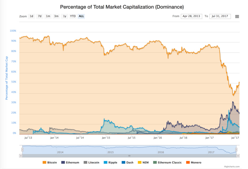 A second, complementary trend appears when we examine Bitcoin’s market capitalization compared to all other cryptocurrencies in this chart from Coinmarketcap.com.