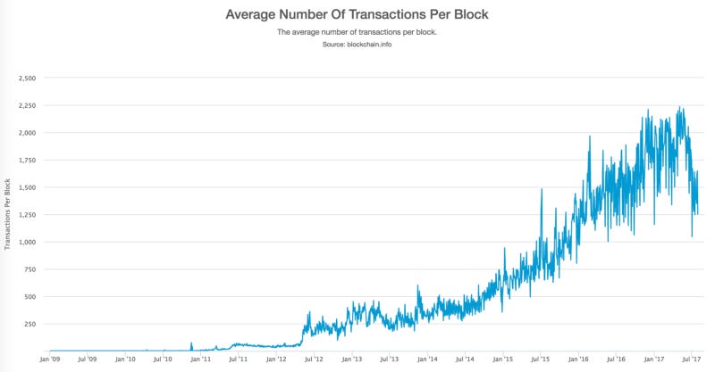 It’s difficult to prove causation, but there are two trends that are correlated to the 2016 rate limiting of Bitcoin’s to 1MB blocks, or around 2.3 transactions per second.