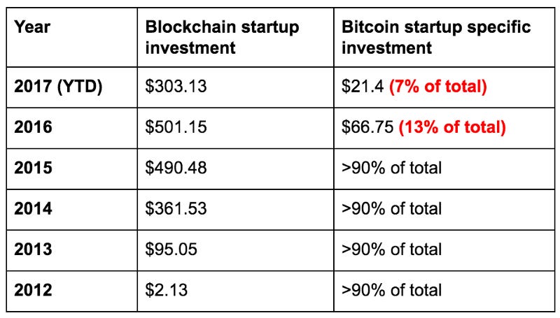 Trend 1: Follow the Money — Blockchain vs. Bitcoin specific investment over time